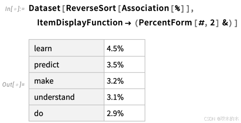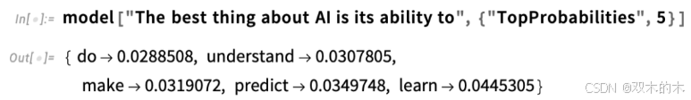 稍后,我们将看看这个神经网的内部,并谈谈它是如何工作的。但现在我们可以把这个 “网络模型” 作为一个黑匣子应用于我们迄今为止的文本,并要求按概率计算出该模型认为应该选择的前五个词: