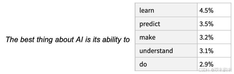 因此,假设我们已经得到了 “人工智能最好的是它能去做 ……” 的文本(“The best thing about AI is its ability to”)。想象一下,扫描数十亿页的人类书写的文本(例如在网络上和数字化书籍中),并找到这个文本的所有实例 —— 然后看到什么词在接下来的时间里出现了多少。