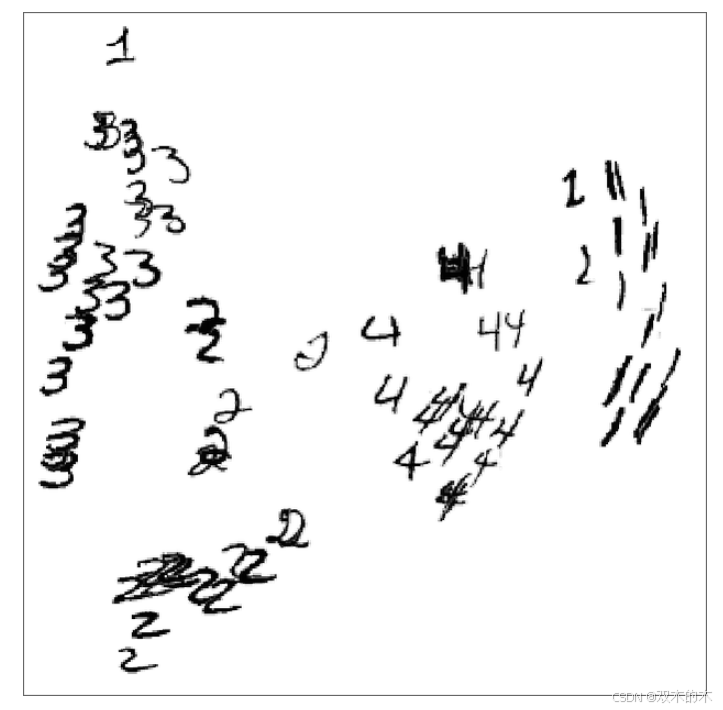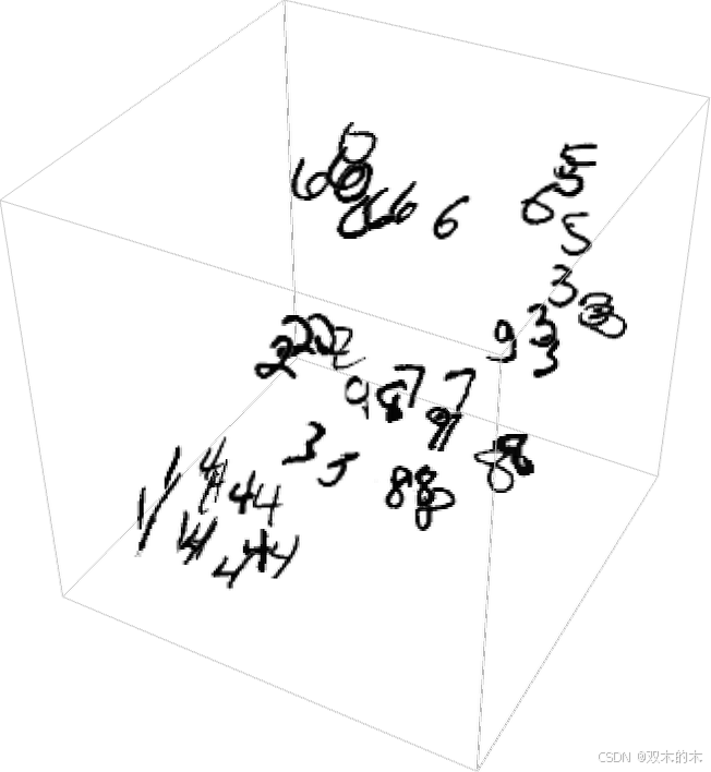 如果我们想对手写数字的 “图像空间” 进行明确的可视化,我们需要 “降低维度”,有效地将我们得到的 500 维向量投射到,例如,三维空间: