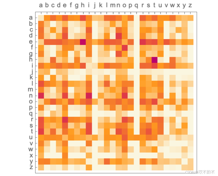 这是一个显示典型英语文本中成对字母(“2-grams”)概率的图。可能的第一个字母显示在页面上,第二个字母显示在页面下:
