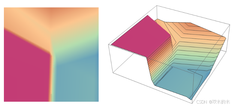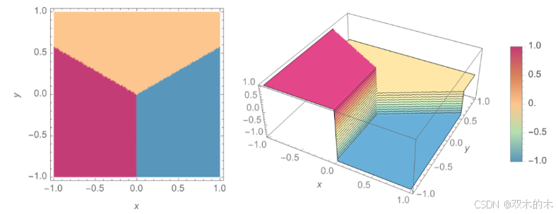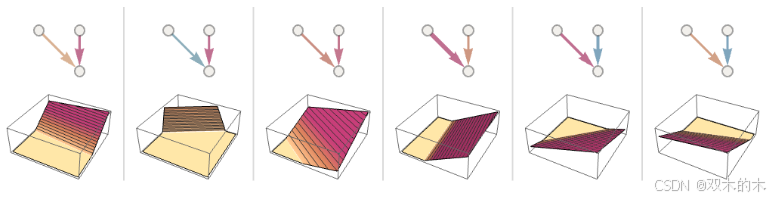 但让我们回到单个神经元上。下面是一个有两个输入(代表坐标 x 和 y)的神经元在选择不同的权重和常数(以及 Ramp 作为激活函数)后可以计算的函数的一些例子: