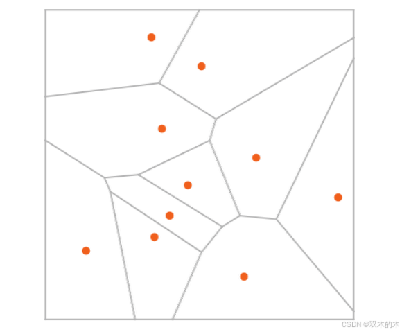 作为一个直接的类比,我们假设在平面上有某些位置,用点表示(在现实生活中,它们可能是咖啡店的位置)。那么我们可以想象,从平面上的任何一点开始,我们总是想在最近的点结束(即我们总是去最近的咖啡店)。我们可以通过将平面划分为由理想化的 “分水岭” 分隔的区域(“吸引盆地”)来表示这一点:
