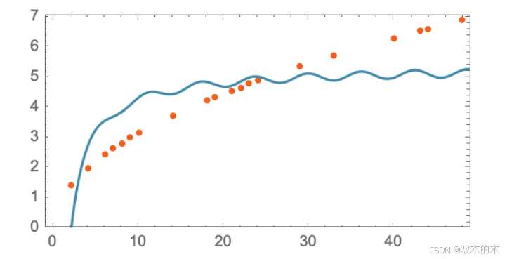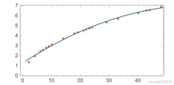 我们怎么知道要在这里尝试使用一条直线呢?在某种程度上我们不知道。这只是数学上简单的东西,而我们已经习惯了这样的事实:我们测量的很多数据都被数学上简单的东西很好地拟合了。我们可以尝试一些数学上更复杂的东西 —— 比如说 a + bx + cx2,然后在这种情况下,我们做得更好: