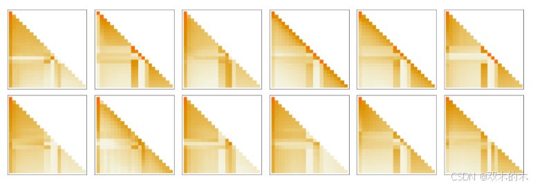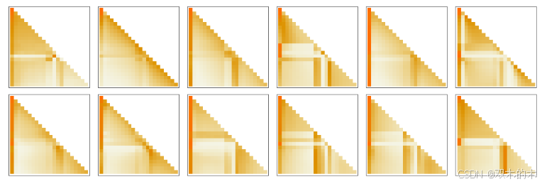 在更详细的层面上,注意力头所做的是以一定的权重重新组合与不同标记相关的嵌入向量中的大块。因此,例如,在第一个注意力区块中的 12 个注意力头(在 GPT-2 中)对上面的 “hello, bye” 字符串有如下(“look-back-all-the-way-beginning-the-sequence-of-tokens”)模式的 “重组权值”: