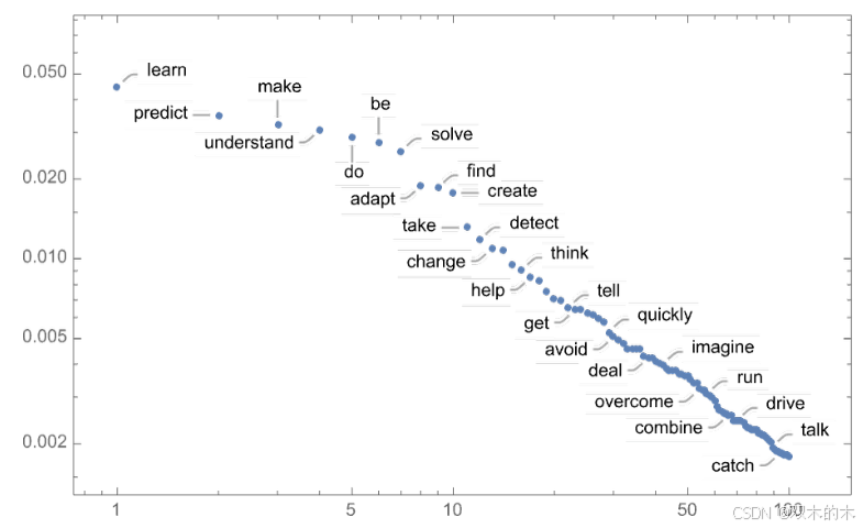 值得指出的是,即使在第一步,也有很多可能的 “下一个词” 可供选择(温度为 0.8),尽管它们的概率下降得很快(是的,这个对数图上的直线对应于 n-1 的 “幂律” 衰减,这是语言的一般统计的特点: