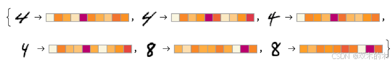 代表 “4” 的神经元仍然有最高的数值。但在其他神经元的数值中也有信息。我们可以期望这个数字列表在某种意义上可以用来描述图像的 “本质”,从而提供我们可以用作嵌入的东西。因此,例如,这里的每一个 4 都有一个稍微不同的 “签名”(或 “特征嵌入”) —— 都与 8 的非常不同: