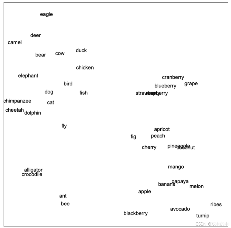 因此,举例来说,我们可以把一个词的嵌入看作是试图在一种 “意义空间” 中排列词语,在这个空间中,以某种方式 “在意义上接近” 的词语在嵌入中出现。实际使用的嵌入 —— 例如在 ChatGPT 中 —— 往往涉及大量的数字列表。但是如果我们把它投射到二维空间,我们就可以显示出嵌入的单词是如何排列的例子: