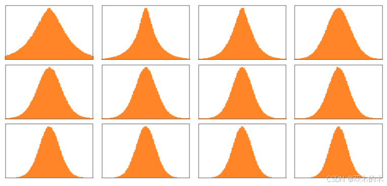 奇怪的是,尽管这些 “权重矩阵” 在不同的注意力块中看起来很相似,但权重的大小分布可能有些不同(而且不总是高斯的):