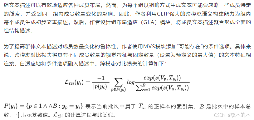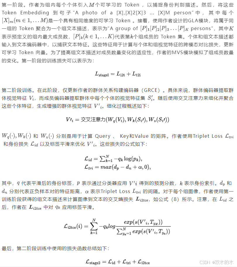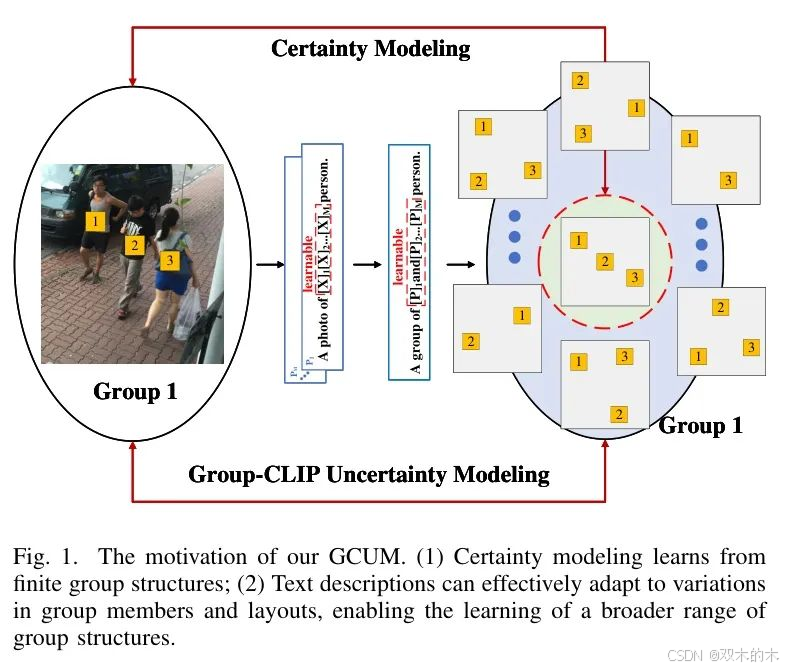 近期,CLIP-ReID 通过为每个身份生成通用的文本描述,引入了视觉语言预训练(VLP)在行人重识别(ReID)中的应用。这种方法利用多模态描述来增强模型区分行人能力。然而,CLIP-ReID在群体识别方面存在困难,因为它无法捕捉群体成员的结构和潜在关联。因此,使用CLIP准确建模复杂的群体结构和群体内部的隐性关系是一个重大挑战。为了解决这个问题,作者将在群体文本描述中引入不确定的隐性表达,例如“一群身穿红衬衫、蓝裤子、黑鞋的人,可能还穿着蓝衬衫、黑裤子、棕色鞋。”这些描述提供了识别个体外观(例如服装和配饰)的线索,而无需调整布局。此外,它们可以通过包含“可能存在”等短语来适应群体大小的变化。如图1所示,这些考虑成员和布局变异性不确定的文本描述,能够识别更广泛的群体结构。