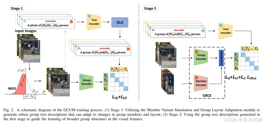 为解决群体ReID的挑战,作者提出了一种新的群体CLIP不确定性建模(GCUM)方法,该方法利用不确定的群体文本描述来处理群体成员和布局的变化。GCUM采用两阶段训练过程来增强对未见过的群体结构的识别。在第一阶段,作者引入了一个群体布局自适应(GLA)模块,使用身份特定的 Token 生成不确定的群体文本描述。该模块包含“可能存在”等术语,以考虑群体组成的变异性。此外,作者还实现了一个成员变体模拟(MVS)模块,该模块使用伯努利分布随机排除某些群体成员,模拟多样化的群体场景。在第二阶段,作者开发了一个群体关系构建编码器(GRCE),以精炼和聚合个体特征。该编码器通过利用跨模态对比损失来过滤掉无关成员,并通过利用文本特征的知识迁移来增强群体识别,并适应群体成员和布局的变化。