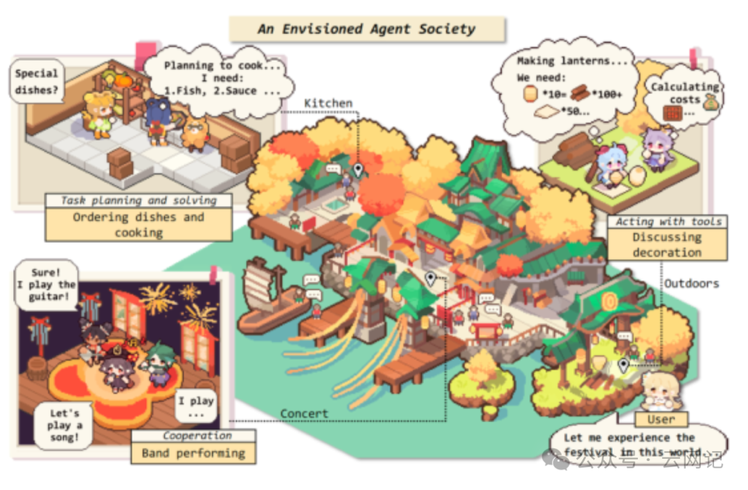 上图:设想一个由智能体构成的和谐社会,人类也可以参与其中。场景取材自《原神》中的海灯节。
