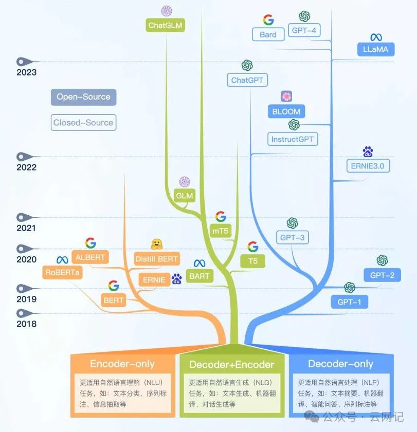 基于Transformer神经网络架构的产品大致可以分为三类:decoder-only LLMs、encoder-only LLMs、encoder-docoder LLMs。下面我们就简要总结各个技术路线的主流产品。
