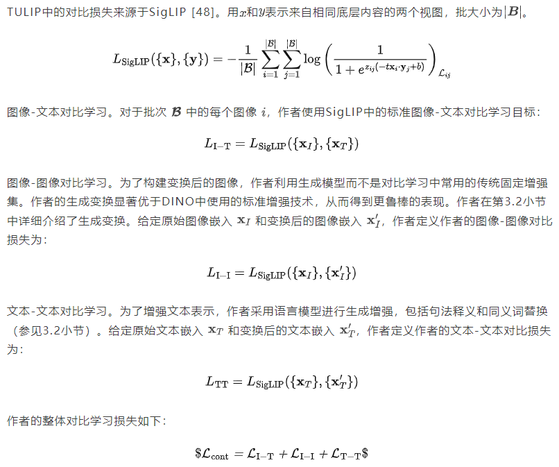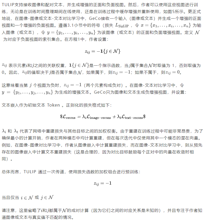 在本节中,作者首先讨论了TULIP如何利用图像和文本在对比学习过程中提供不同的视角(参见3.1小节)。接着,作者介绍了TULIP如何通过生成增强来从“现实”中创建不同的视角(参见3.2小节),以及TULIP如何通过重建损失来正则化训练,以学习更鲁棒的特征表示(参见3.3小节)。
