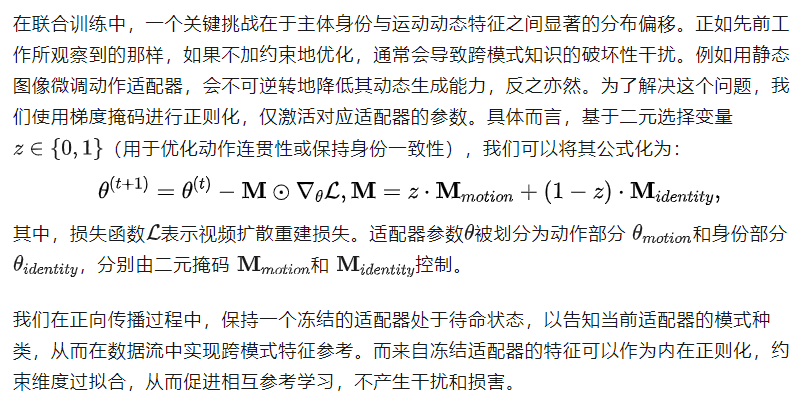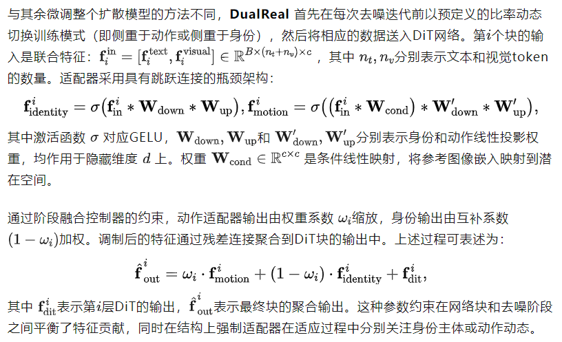 双域感知适配模块 动态切换当前训练阶段(身份或运动),利用冻结维度的先验信息指导另一个模式的学习,并通过正则化策略防止知识泄漏;阶段融合控制器基于不同的去噪阶段和DiT网络深度,为各模式分配自适应的粒度控制,避免在不同阶段出现冲突,从而实现身份与运动模式的无损融合。