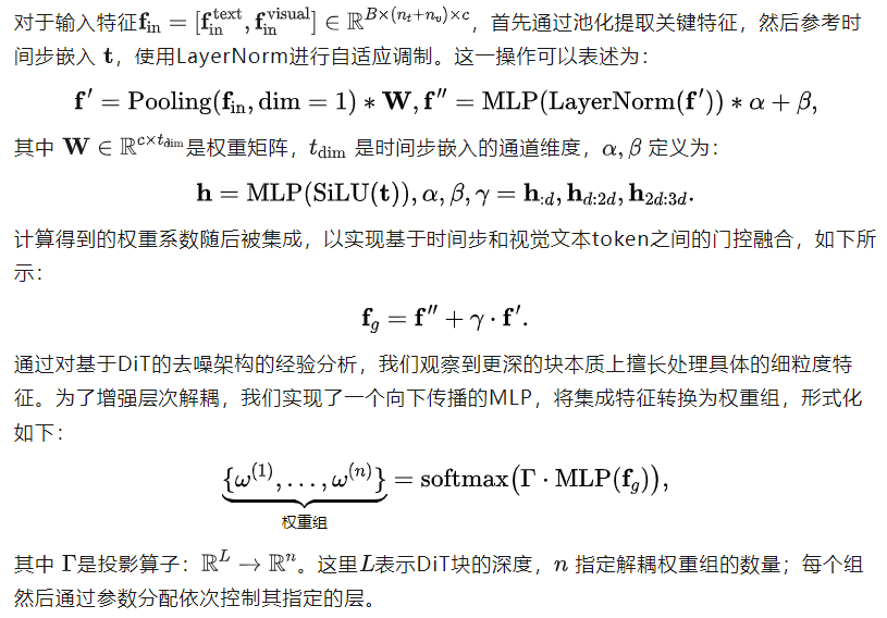 具体来说,阶段融合控制器根据去噪时间步和融合的文本-视觉特征,动态生成多组针对不同DiT深度层的缩放权重。