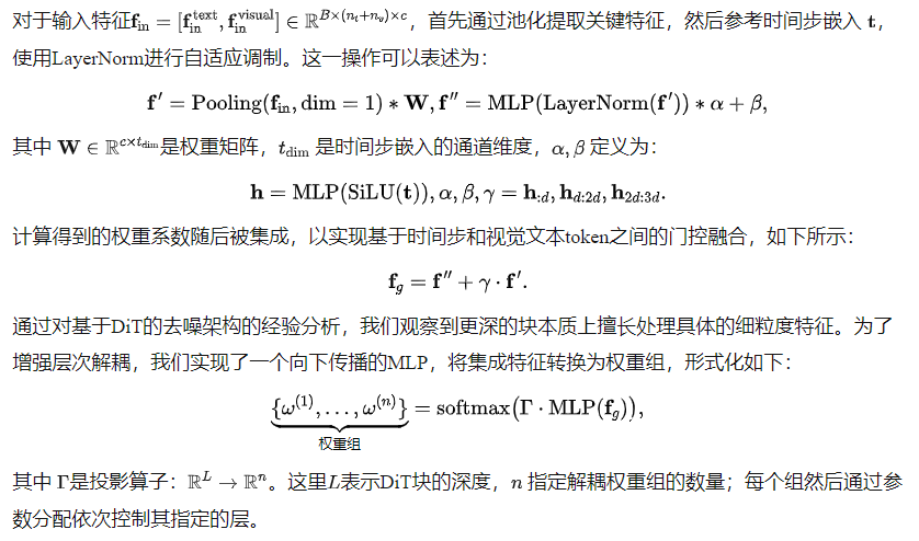 具体来说,阶段融合控制器根据去噪时间步和融合的文本-视觉特征,动态生成多组针对不同DiT深度层的缩放权重。