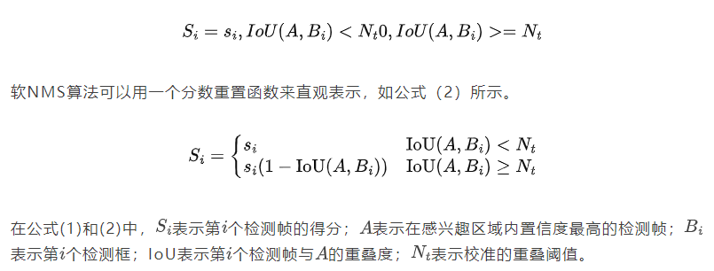 非极大值抑制(NMS)是目标检测模型中一种关键的后处理技术,旨在移除冗余的相互重叠的边界框。传统的NMS算法在当前检测框与得分最高的框之间的IoU(IoU)超过某一阈值时,将该检测框的得分降为0[25]。这种方法可能导致存在显著重叠的物体框被遗漏,从而降低小物体的召回率。