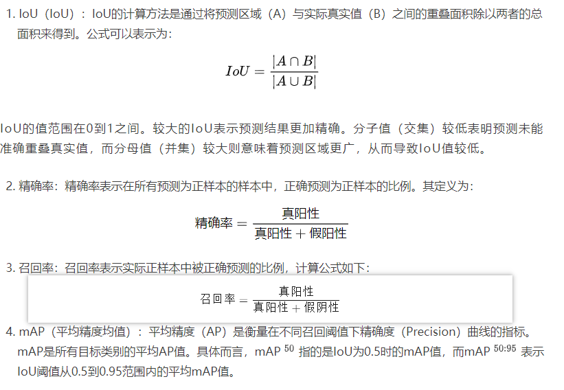 1. IoU(IoU):IoU的计算方法是通过将预测区域(A)与实际真实值(B)之间的重叠面积除以两者的总面积来得到。公式可以表示为: