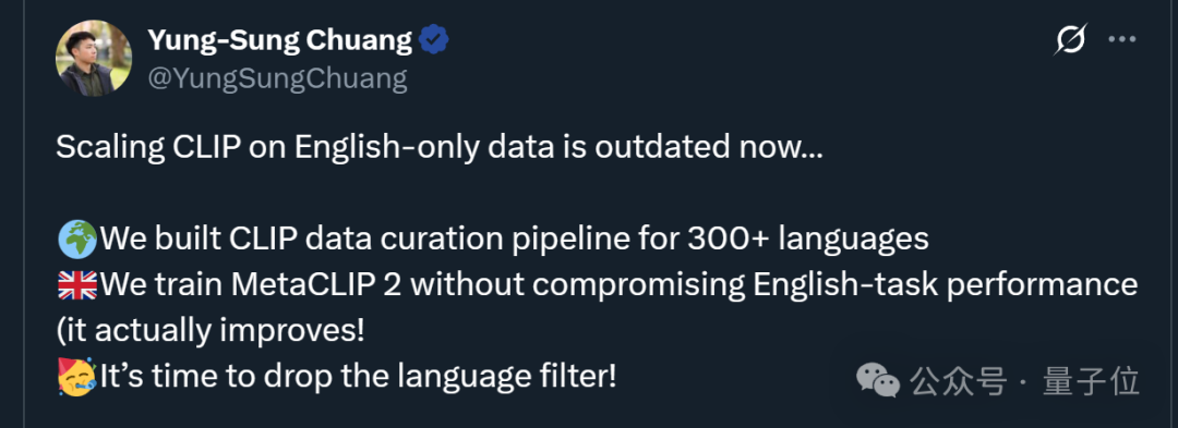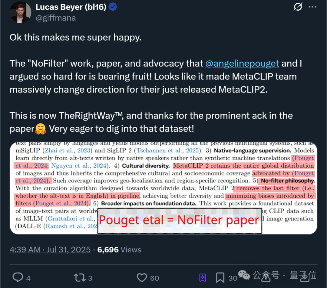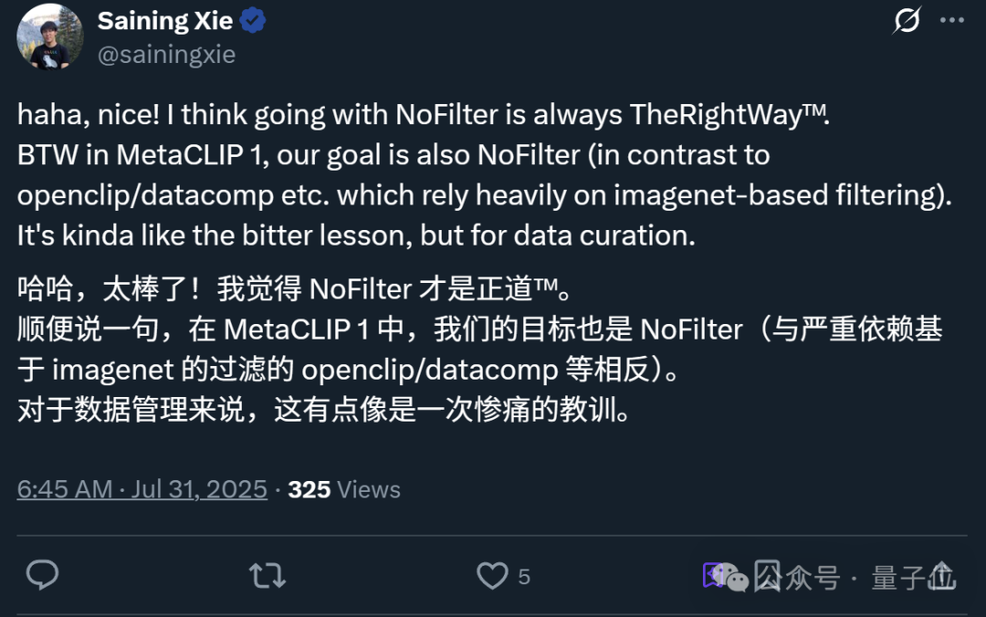 很高兴看到我们提出并始终倡导的“NoFilter”理念能在MetaCLIP 2中得到应用。