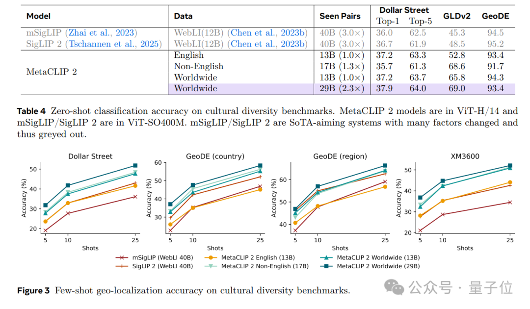 一方面,它在文化多样性任务(如地理定位)上表现更优,如在Dollar Street、GLDv2等数据集上,全球数据训练的模型准确率显著高于纯英语或纯非英语模型。