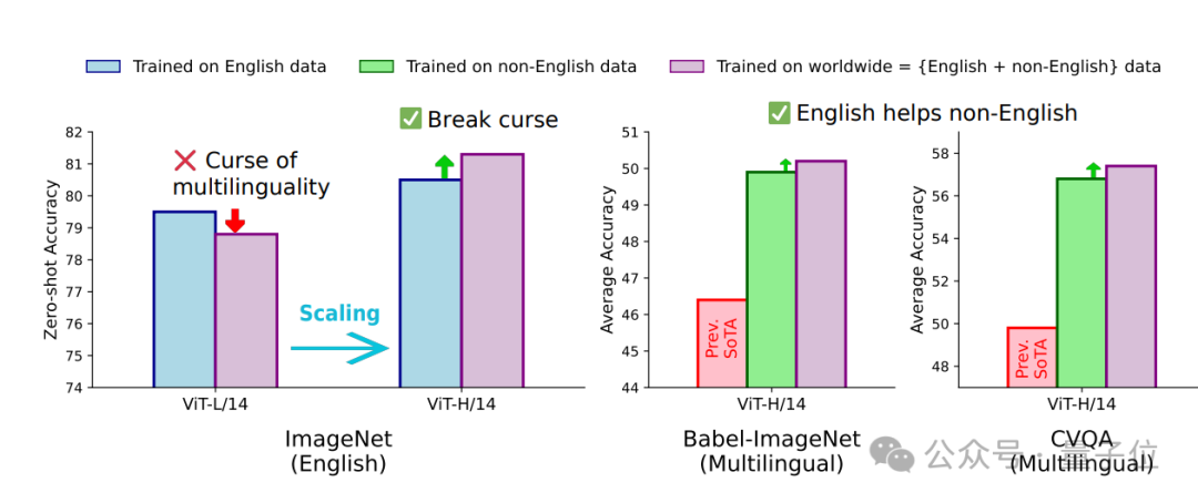 另一方面,团队发现模型大小很关键——小一点的模型(如ViT-L/14)还会受“多语言诅咒”,但大一点的ViT-H/14能打破诅咒,让英语和非英语能力一起提升。