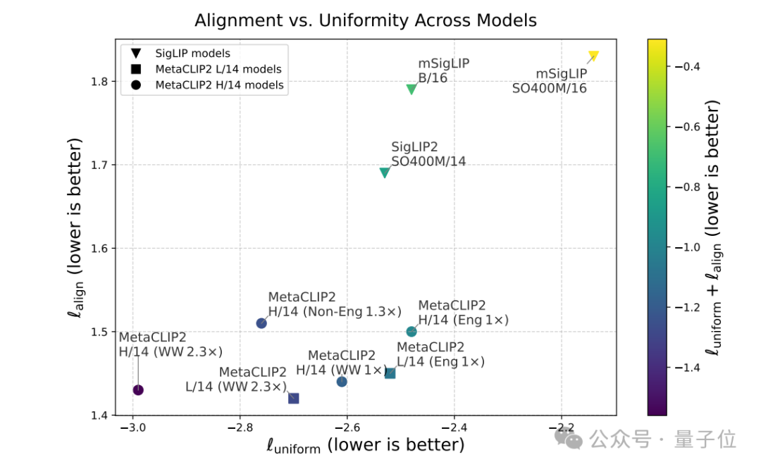 另一方面,它在对齐性(图像-文本相关性)和均匀性(视觉嵌入分布)上的得分同样更优。