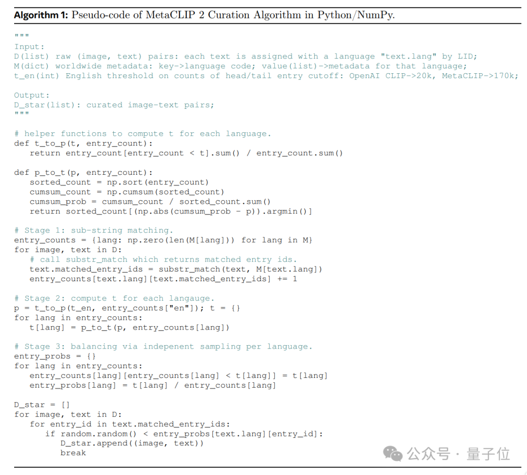 下图为MetaCLIP 2筛选全球多语言图像-文本对的伪代码(用Python/NumPy风格编写):