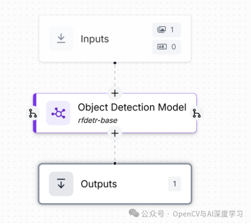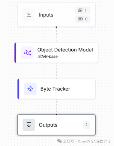 此工作流结合了对象检测模型 (rf-detr-base) 和 ByteTrack 块。检测模型识别每个视频帧中的对象(如人、狗等),而 ByteTrack 为每个对象分配一个唯一的 ID 并跨帧跟踪它。