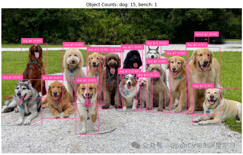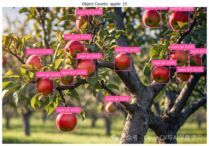 目标计数:通过对各个检测相加来计算检测到的目标的总数。每个有效的边界框或分段实例都被视为一个计数。