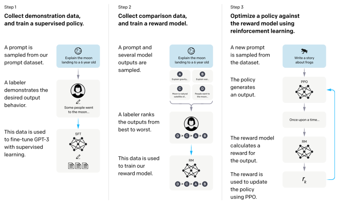 在ChatGPT之前,大语言模型已经出现了很长时间,只不过一直存在于研究机构,并未向大众开放。比如OpenAI公司早在2022年3月就研究出了具有“涌现”能力的逻辑性很强的GPT3.5,但是直到2022年11月才推出了面向公众的产品ChatGPT,让“阳春白雪”走向了普通大众。这7个月的时间,OpenAI为了让普通大众使用大模型,为了让大模型从“实验品”成为真正的“产品”,OpenAI做了一件很重要的事情,那就是RLHF。
