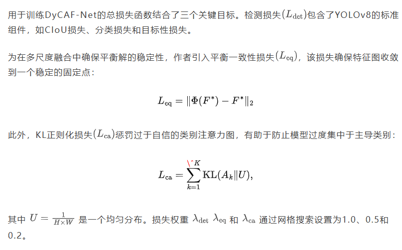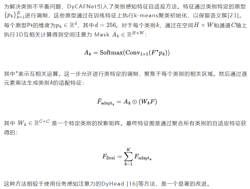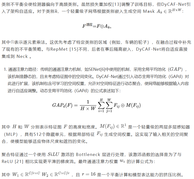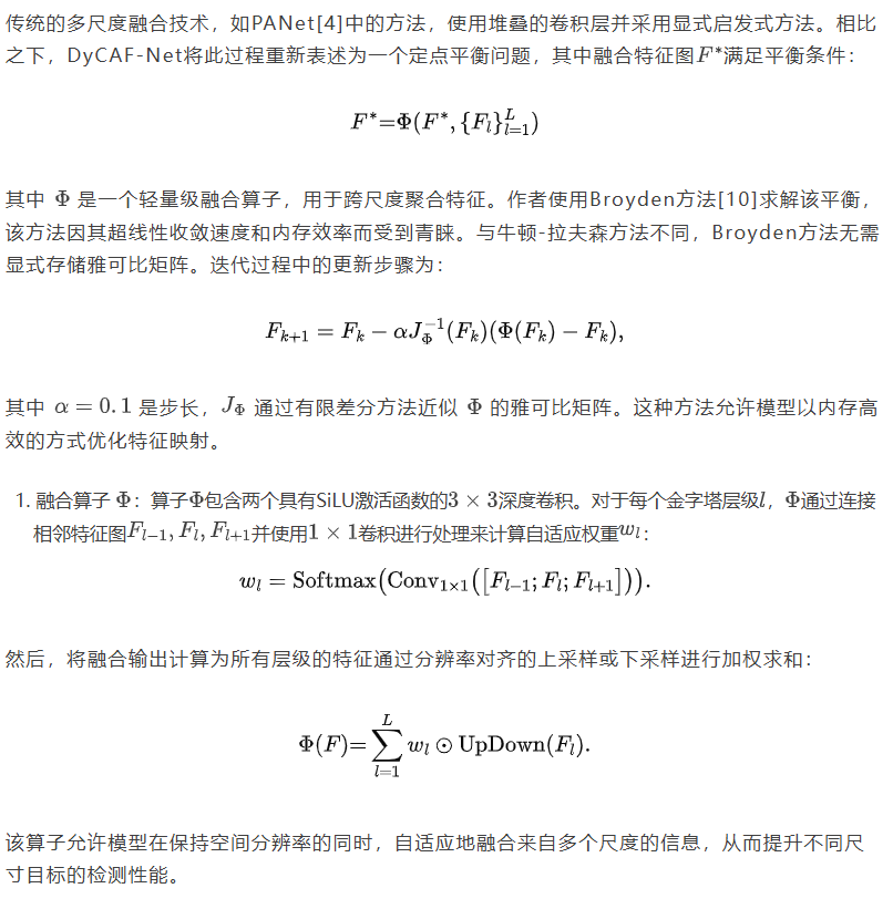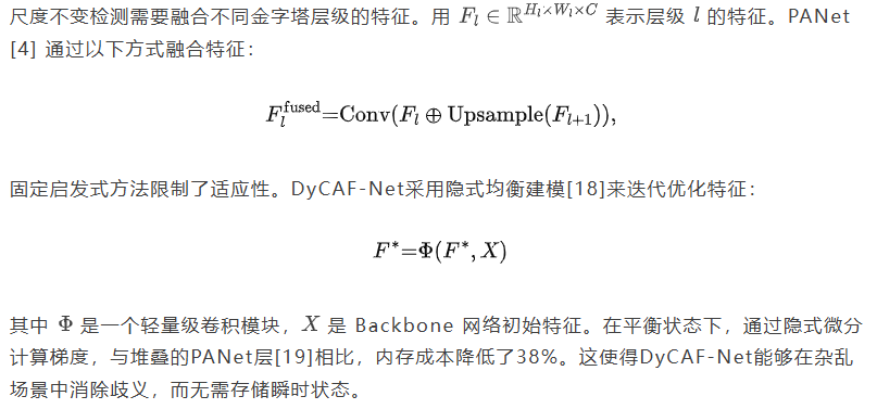 为此,作者提出了动态类别感知融合网络(DyCAF-Net),这是一个重新思考 Neck 设计的创新检测框架,通过三个互补原则实现:1. 输入条件动态融合:用基于隐式平衡的 Neck 结构替代静态多尺度融合规则,该结构根据输入场景学习传播特征直至收敛,支持跨尺度的内存高效、与深度无关的特征细化。2. 双重动态注意力:利用基于输入和预测目标类别的空间和通道注意力机制进行动态调制,实现遮挡或杂乱环境中的解耦推理。3. 检测Head中的类别感知调制:结合轻量级的类别特定重新校准模块,强调语义相关特征,提高罕见或视觉相似类别的判别能力。