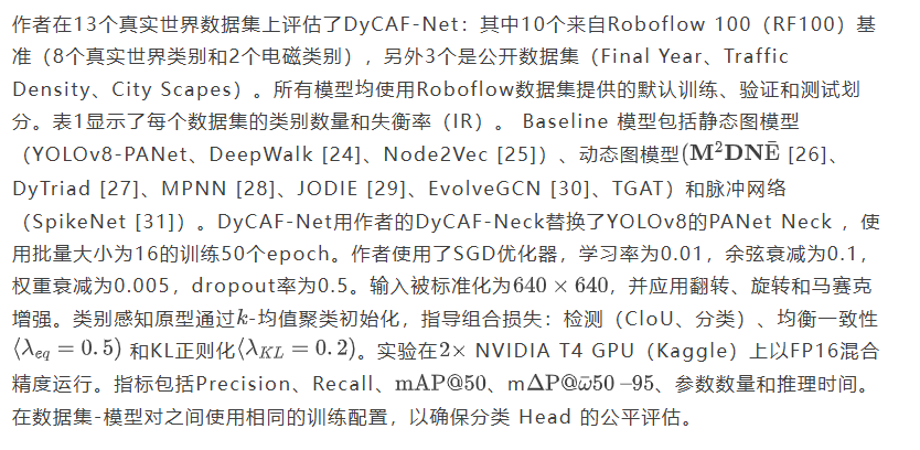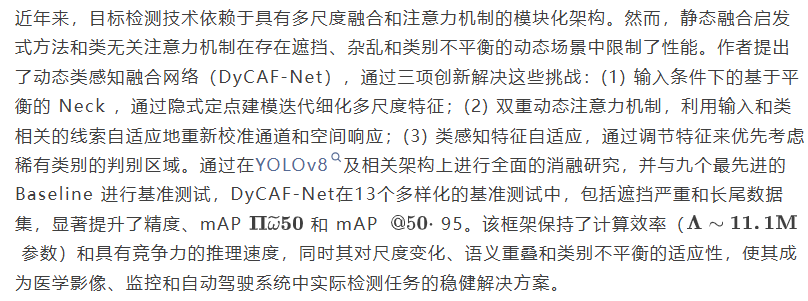 作者提出了DyCAF-Net,一种轻量级且高效的检测 Neck 结构,用于在YOLOv8中替代PANet,其采用动态类别感知融合和基于均衡的细化机制。DyCAF-Net在10/13个基准测试中实现了更高的mAP@50-95,特别是在不平衡和遮挡场景中表现出色,同时保持了较低的推理延迟和参数效率。其性能提升证明了自适应特征融合和类别感知重新校准对实际检测任务的益处。