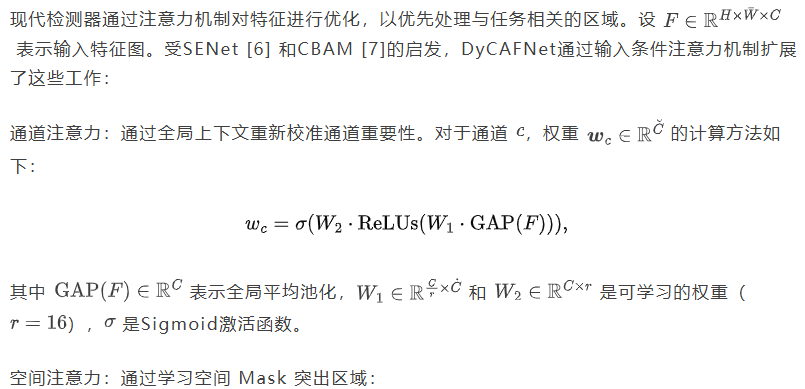 DyCAF-Net引入了一种动态双重注意力机制,旨在通过自适应地重新校准通道和空间特征响应来增强特征的可区分性,该机制根据输入内容进行条件化操作。该机制通过两个互补的路径——通道注意力和空间注意力——协同工作,以细化特征表示。这些路径强调与任务相关的区域,同时抑制不太重要的背景杂波,从而提高复杂环境中目标检测的性能。