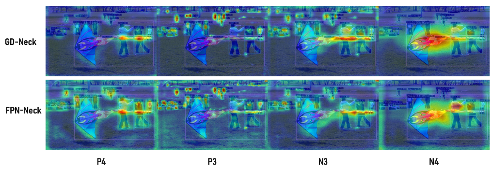 并且,我们在下图中对比了 Gold - YOLO 和 YOLOv6 的颈部 CAM 可视化结果。