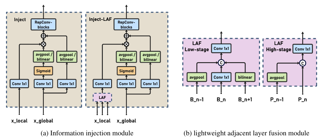如上图(b)所示,高阶段聚合与分配分支(High - GD)融合由低阶段聚合与分配分支(Low - GD)生成的 {P3, P4, P5} 特征 。