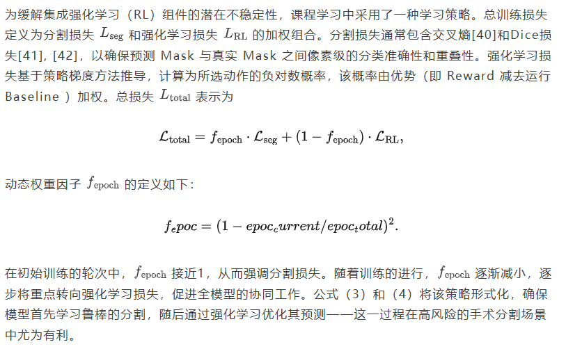 3. 课程学习策略引导训练过程:采用渐进式训练策略,先强调分割损失,再逐步引入强化学习损失,提升模型训练稳定性和最终性能。