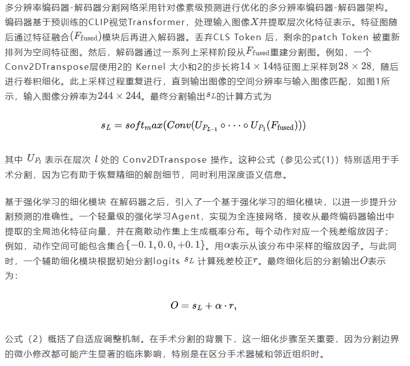 2. 基于强化学习的自适应残差校正机制:通过RL Agent动态调整分割输出,提升分割边界精度,尤其在区分手术器械与邻近组织时具有临床意义。