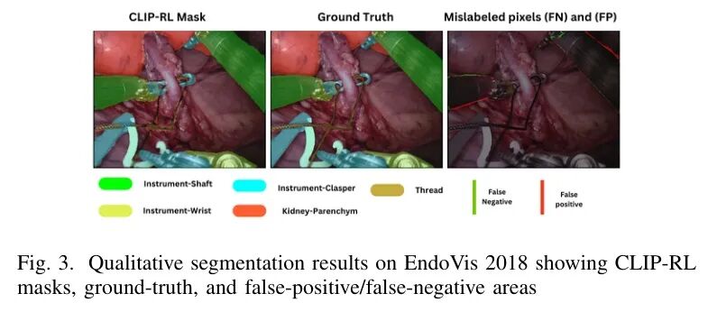 EndoVis 2018是一个整体手术场景分割挑战赛,其中同时分割手术工具和解剖结构。结果表明,CLIP-RL在分割性能上优于当前最先进的模型。如表2所示,CLIP-RL实现了最高的平均IoU(0.81)和Dice分数(0.88),优于SegFormer(0.75 mIoU,0.82 Dice)、AdaptiveSAM(0.65 mIoU,0.69 Dice)和nn-UNet(0.61 mIoU,0.73 Dice)。图3展示了CLIP-RL的分割 Mask 与真实值。可以看出,CLIP-RL正确分割了所有工具,除了线这一对模型具有挑战性的类别。