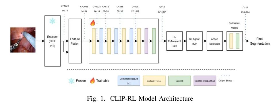 在这项工作中,作者提出了CLIP-RL,一个用于手术图像分割的新型框架,该框架集成了多分辨率编码器-解码器网络和基于强化学习(RL)的细化模块。通过利用冻结的CLIP视觉Transformer,CLIP-RL能够有效捕捉细粒度的空间细节和High-Level语义信息,确保解剖结构和手术器械的准确分割。强化学习(RL)模块通过自适应残差校正机制进一步细化分割预测,允许动态调整以提升分割精度。