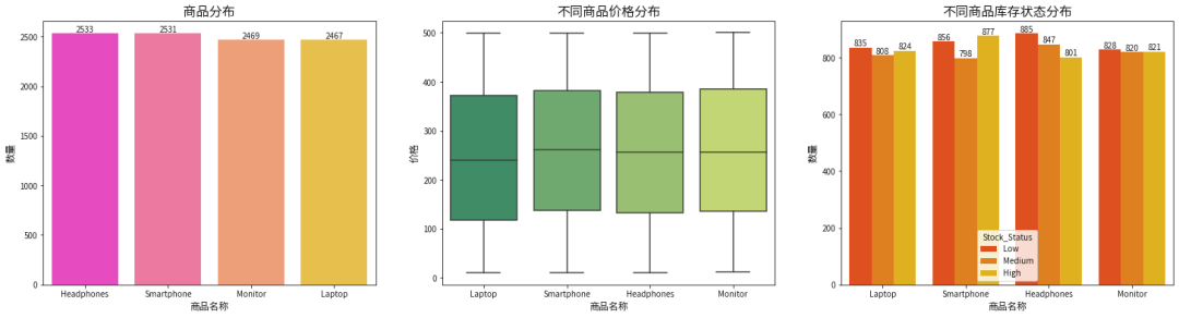 plt.figure(figsize=(25, 6))plt.subplot(1, 3, 1)# 类别分布分析category_distribution = data['Product Name'].value_counts().reset_index()category_distribution.columns = ['Product Name', 'Count']sns.barplot(x='Product Name', y='Count', data=category_distribution, palette='spring')plt.title('商品分布', fontsize=16)plt.xlabel('商品名称', fontsize=12)plt.ylabel('数量', fontsize=12)for p in plt.gca().patches:plt.gca().annotate(format(p.get_height(), '.0f'), (p.get_x() + p.get_width() / 2., p.get_height()), ha = 'center', va = 'center', xytext = (0, 5), textcoords = 'offset points')# 类别间价格比较plt.subplot(1, 3, 2)sns.boxplot(x='Product Name', y='Price', data=data, palette='summer')plt.title('不同商品价格分布', fontsize=16)plt.xlabel('商品名称', fontsize=12)plt.ylabel('价格', fontsize=12)# 类别间库存状态分析plt.subplot(1, 3, 3)sns.countplot(x='Product Name', hue='Stock_Status', data=data, palette='autumn')plt.title('不同商品库存状态分布', fontsize=16)plt.xlabel('商品名称', fontsize=12)plt.ylabel('数量', fontsize=12)for p in plt.gca().patches:plt.gca().annotate(format(p.get_height(), '.0f'), (p.get_x() + p.get_width() / 2., p.get_height()), ha = 'center', va = 'center', xytext = (0, 5), textcoords = 'offset points')plt.show()