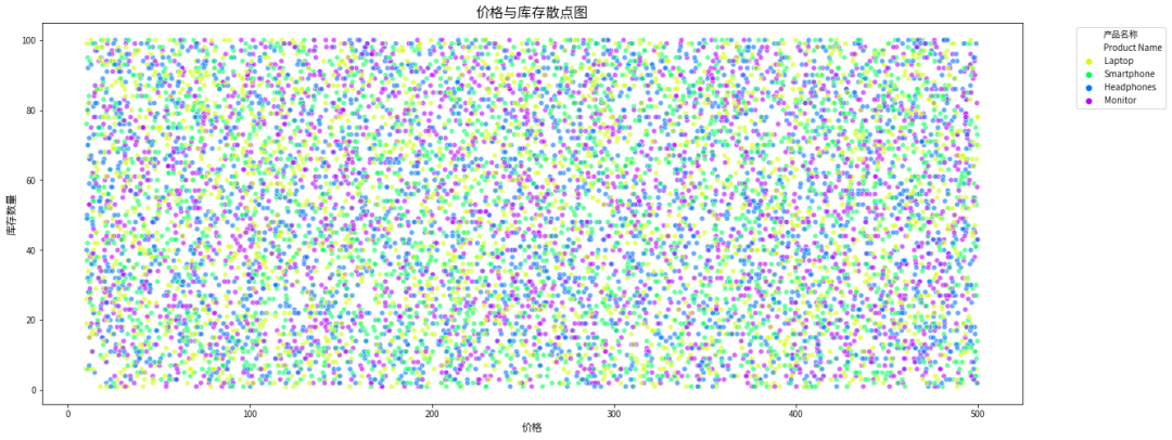 # 价格与库存散点图plt.figure(figsize=(20, 8))scatter_plot = sns.scatterplot(x='Price', y='Stock Quantity', hue='Product Name', data=data, alpha=0.6, palette='hsv')plt.title('价格与库存散点图', fontsize=16)plt.xlabel('价格', fontsize=12)plt.ylabel('库存数量', fontsize=12)plt.legend(bbox_to_anchor=(1.05, 1), loc='upper left', title='产品名称')plt.show()