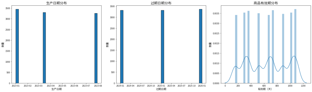 import matplotlib.dates as mdatesplt.figure(figsize=(20, 6))# 制造日期分布plt.subplot(1, 3, 1)plt.hist(data['Manufacturing Date'], bins=30, edgecolor='black')plt.title('生产日期分布', fontsize=16)plt.xlabel('生产日期', fontsize=12)plt.ylabel('数量', fontsize=12)plt.gca().xaxis.set_major_formatter(mdates.DateFormatter('%Y-%m')) # 设置日期显示格式# 过期日期分布plt.subplot(1, 3, 2)plt.hist(data['Expiration Date'], bins=30, edgecolor='black')plt.title('过期日期分布', fontsize=16)plt.xlabel('过期日期', fontsize=12)plt.ylabel('数量', fontsize=12)plt.gca().xaxis.set_major_formatter(mdates.DateFormatter('%Y-%m')) # 设置日期显示格式# 有效期分布plt.subplot(1, 3, 3)sns.distplot(data['life_cycle'], bins=30, kde=True)plt.title('商品有效期分布', fontsize=16)plt.xlabel('有效期(天)', fontsize=12)plt.ylabel('数量', fontsize=12)plt.tight_layout()plt.show()