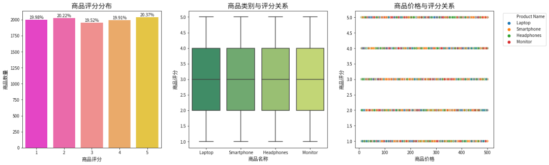 plt.figure(figsize=(20, 6))# 产品评分分布plt.subplot(1, 3, 1)sns.countplot(x='Product Ratings', data=data,palette='spring')plt.title('商品评分分布', fontsize=16)plt.xlabel('商品评分', fontsize=12)plt.ylabel('商品数量', fontsize=12)for p in plt.gca().patches:height = p.get_height()plt.text(p.get_x() + p.get_width() / 2, height + 5, '{:1.2f}%'.format(height / len(data) * 100), ha='center', va='bottom')# 评分与类别关系plt.subplot(1, 3, 2)sns.boxplot(x='Product Name', y='Product Ratings', data=data,palette='summer')plt.title('商品类别与评分关系', fontsize=16)plt.xlabel('商品名称', fontsize=12)plt.ylabel('商品评分', fontsize=12)# 评分与价格关系plt.subplot(1, 3, 3)sns.scatterplot(x='Price', y='Product Ratings', hue='Product Name', data=data, alpha=0.6)plt.title('商品价格与评分关系', fontsize=16)plt.xlabel('商品价格', fontsize=12)plt.ylabel('商品评分', fontsize=12)plt.legend(bbox_to_anchor=(1.05, 1), loc='upper left')plt.show()