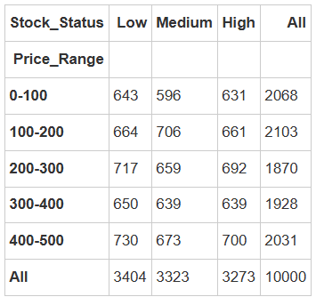 price_stock_table = pd.crosstab(data['Price_Range'], data['Stock_Status'], margins=True)price_stock_table