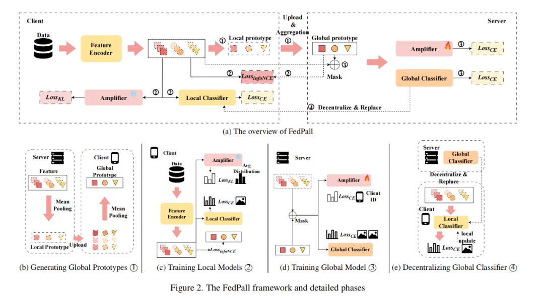 ③ 全局模型训练:服务器通过整合来自各客户端的混合特征集及对应客户端 ID 来更新全局放大器,并利用来自客户端的混合原型特征和类别标签更新全局分类器。