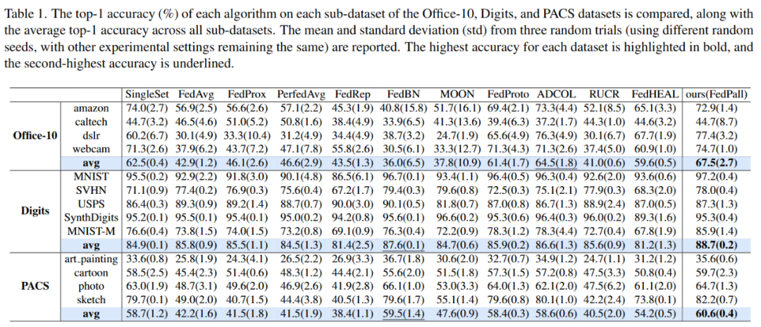 FedPall 的平均准确率在三个数据集中均持续优于 ADCOL,提升幅度约 1.1 至 3 个百分点。尽管 FedBN 在 Digits 和 PACS 数据集上能相对接近我们方法的准确率,但我们的方法在 Office-10 数据集上以 31.5 个百分点的显著优势超越它。