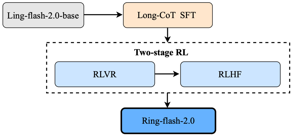 百灵大模型团队首先采用 Long-CoT SFT,采用包含数学、代码、逻辑和科学四大领域为主体的多学科高质量推理数据集,让模型 “学会思考”;第二步,通过可验证奖励的 RLVR(Reinforcement Learning with Verifiable Rewards),把推理逼到极限;随后,加入 RLHF,用高质量人类偏好数据,把格式、安全、可读性拉回舒适区。