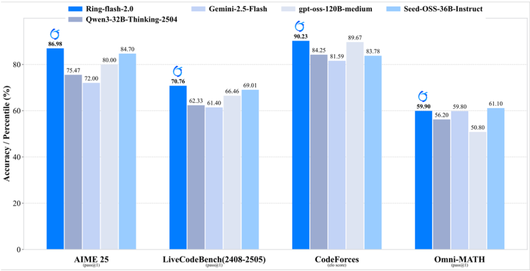 “MoE+Long-CoT(长思维链)+RL(强化学习)” 这条技术路线存在难以兼顾训练稳定性和效果的难题。9 月 19 日,蚂蚁百灵大模型团队把 “难啃的骨头” 直接做成开源礼包 ——Ring-flash-2.0。100B 总参、6.1B 激活,数学 AIME25 拿下 86.98 分,CodeForces elo 分数 90.23,128K 上下文实测 200+token/s。