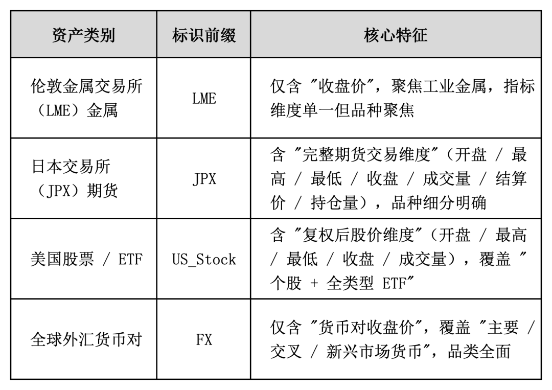 提供的数据覆盖了全球4市场多品种的标准化原始指标,分别来自于 “金属、期货、美股 / ETF、外汇”