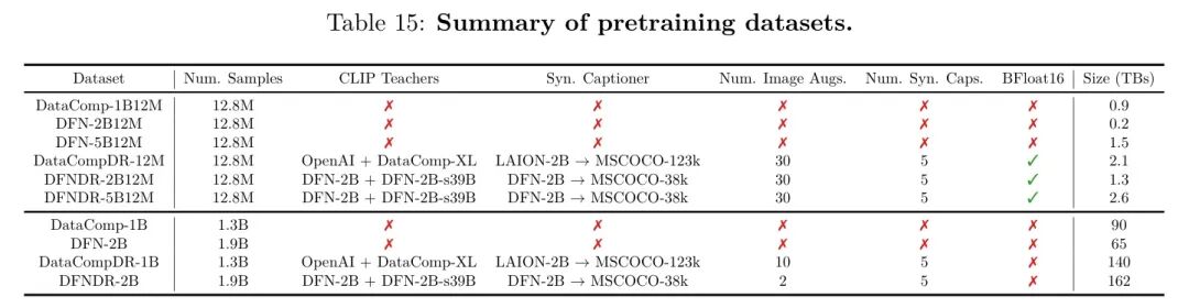 作者的最终数据集DFNDR-5B12M和DFNDR-2B12M包含5个使用MSCOCO-38k进行微调的合成标题,以及来自第2.3节讨论的两个DFN2B-ViTL/14教师模型集成的嵌入,这些嵌入用于30种图像增强以及真实标题和合成标题。作者探索了仅在DFN的2B子集上进行训练,与使用DataComp的12B数据池之外的3B样本扩展的完整5B数据集进行对比。表7显示,对于两个数据集,在38项评估中的平均性能都在标准偏差范围内,而使用来自5B的12M样本时,ImageNet-1k验证准确率更高。然而,作者没有观察到在更大规模训练时这种改进能够保持,因此作者将作者的方案限制在2B数据集上。
